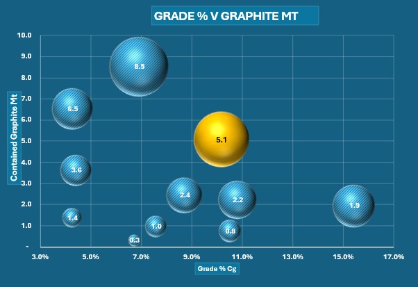 Information from the table above has also been respresented graphically below in Figure 3. This figure demonstrates that the only project that has a graphite grade greater than 9% and contained graphite tonnes above 4 million tonnes is the Lac Carheil project as indicated in the yellow bubble below.