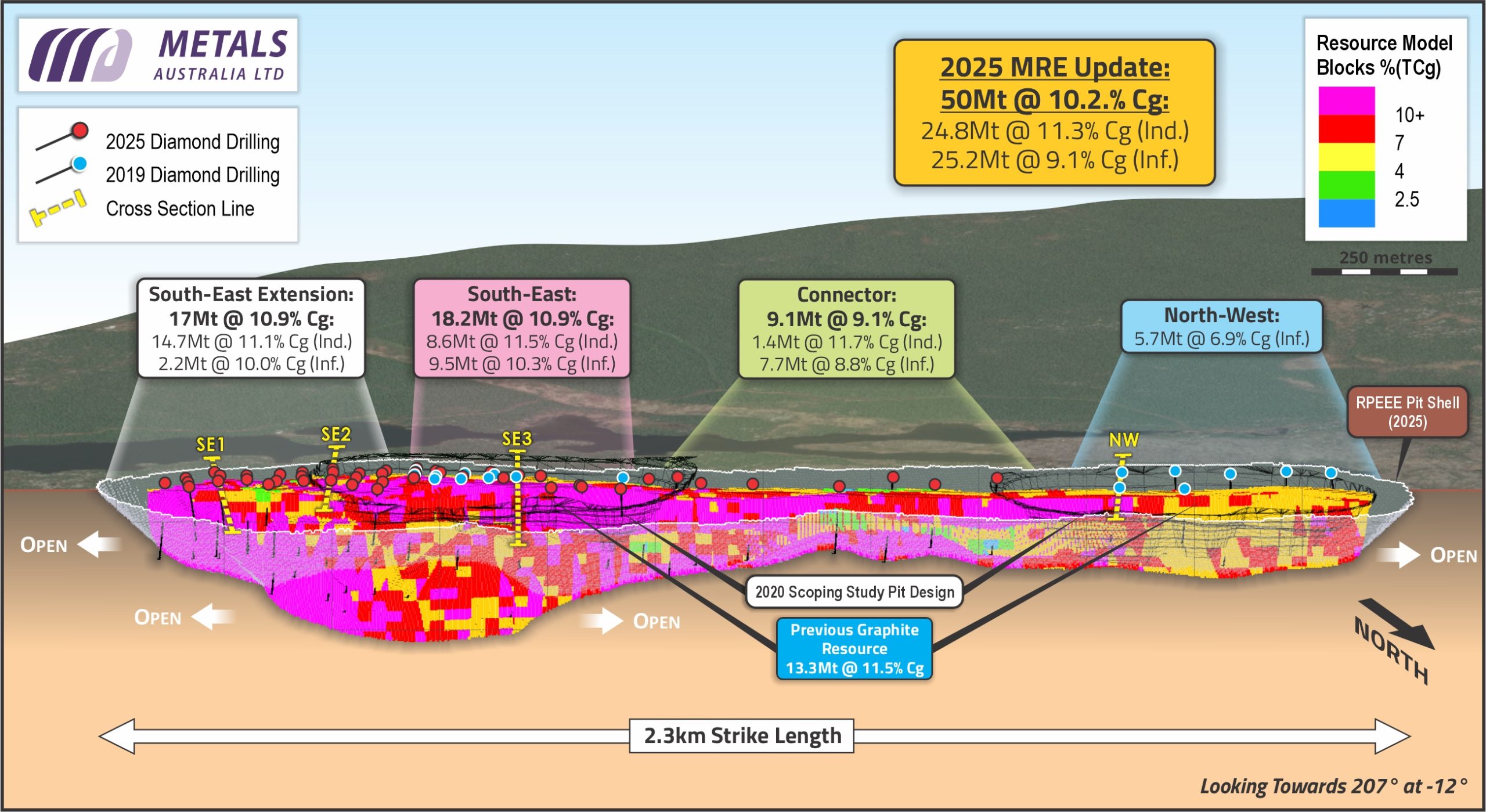 Additional test work was undertaken on selected holes within the resource that were being assessed for geotechnical and geochemical study purposes. The multi element results revealed widespread mineralisation within the graphite zones. The significance of this finding is that the minerals present will all be mined with the graphite, further concentrated in process plant and (currently) deposited in dry tailings stockpiles. Further work is now underway to more broadly test all graphite zones within the SE and SE extension zones of the mineral resource, given they will form the basis of the initial planned open cut mine.