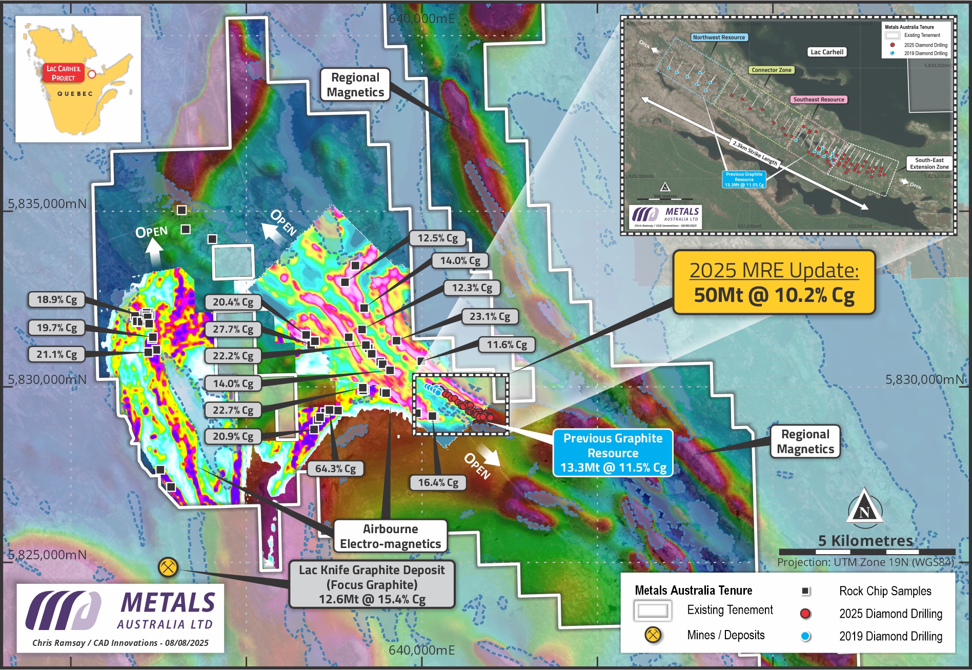 Figure 1: Lac Carheil Graphite Project: New MRE within World class graphite endowment covering 10 mapped and sampled graphite trends over 36km in strike length. Only 1/3 of the claims held have been investigated