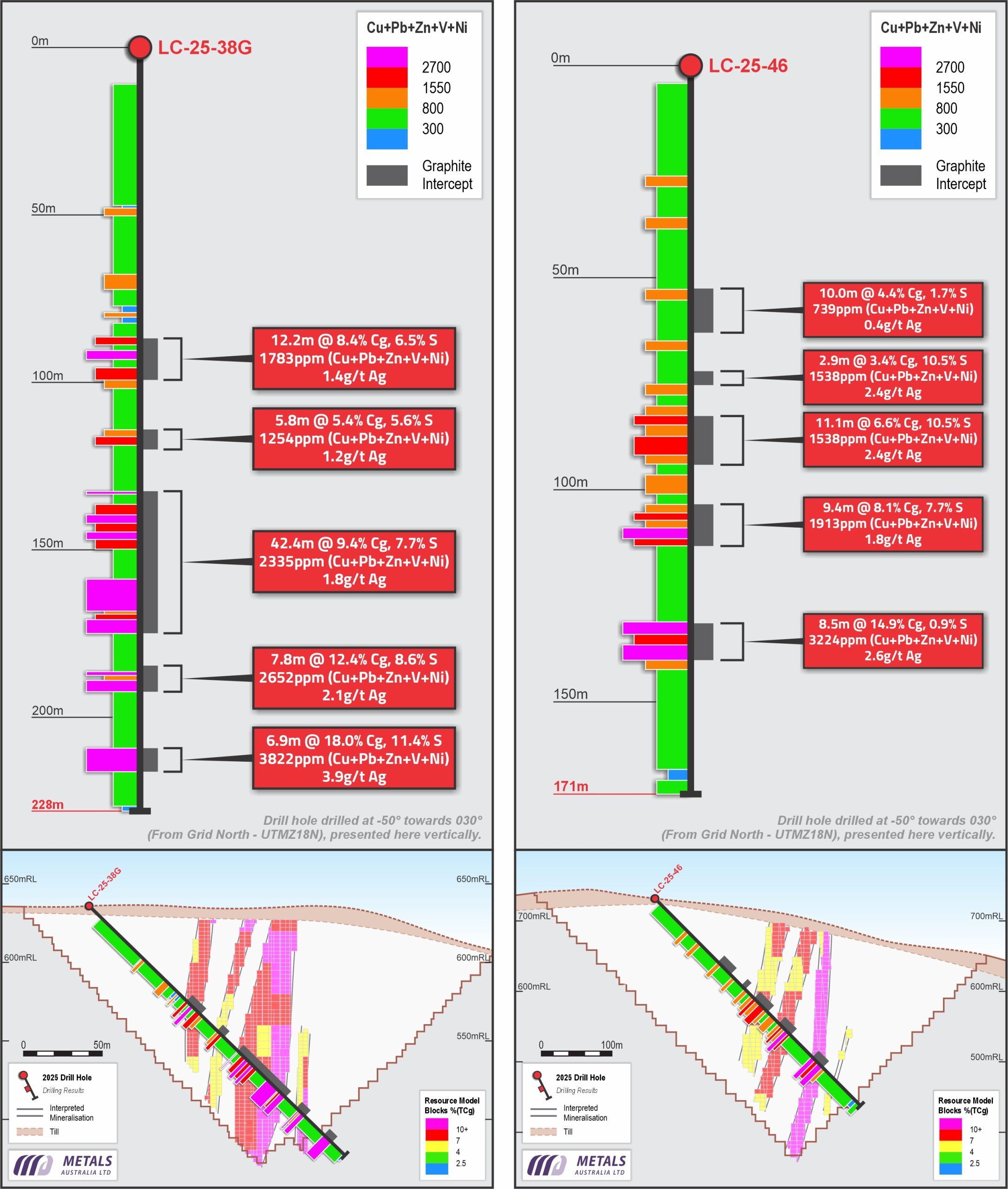 Figure 5: LC-25-38G (Southeastern zone) & Fig 6: LC-25-38G (Connector zone): Figures show downhole log of graphite zones and related mineralisation ((Cu + Pb + Zn + V + Ni Combined basis) & Silver – g/t) and Cross Section of each hole shown beneath the log. Hole collar positions are also shown in Fig 1.