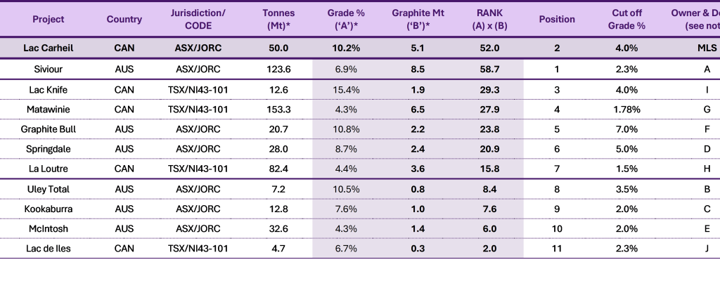 Table 1 provides a summary of the project name, country, total mineral resource, graphite grade and the total contained graphite tonnage reported in resource. A ranking measure assesses the resource grade and the total graphite tonnage contained. This measure [a product of grade and contained tonnes] demonstrates that Lac Carheil is a top ranked project (#2). Only two projects listed currently have more contained graphite reported. Lac Carheil has the potential to grow significantly, given less than 7% of mapped and sampled trends have been drilled so far.